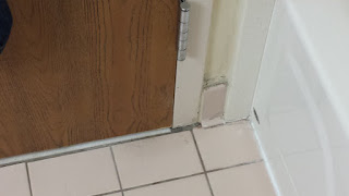 This was the condition of the bathroom. It was less than clean. Notice the stains on the floor and as well as the ceiling. Notice the grit around the pipes. These were the exposed pipes running under the countertop. These weren't pipes hidden inside cabinets under the sink. You are looking at these pipes when you sit on the commode. Notice the water line running from the outlet to the commode (bottom left). The bathroom needs a good scrubbing as well as some repair work.